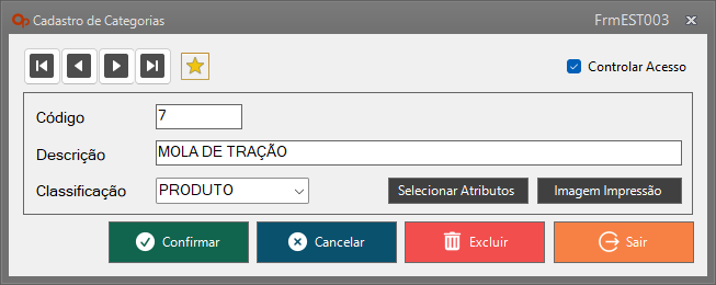 Perceba que a tela de cadastro de categorias possui uma caixa de seleção no canto superior, com a descrição Controlar Acesso. Esta caixa de seleção está disponível em quase todas as telas do sistema. Através dela, o administrador poderá determinar se esta tela deve ter um acesso controlado ou não. Uma vez que a caixa de seleção for marcada, para que um usuário comum tenha acesso a esta tela, a permissão de acesso deverá ser aplicada na tela de Permissões de Usuário.