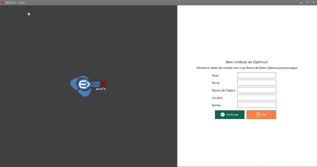 Na primeira vez em que o sistema for executado, serão solicitados ao usuário as informações de conexão com o banco de dados. Estas informações são extremamente necessárias para utilização do software.